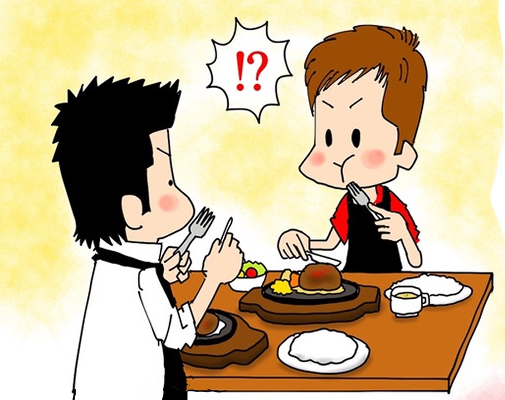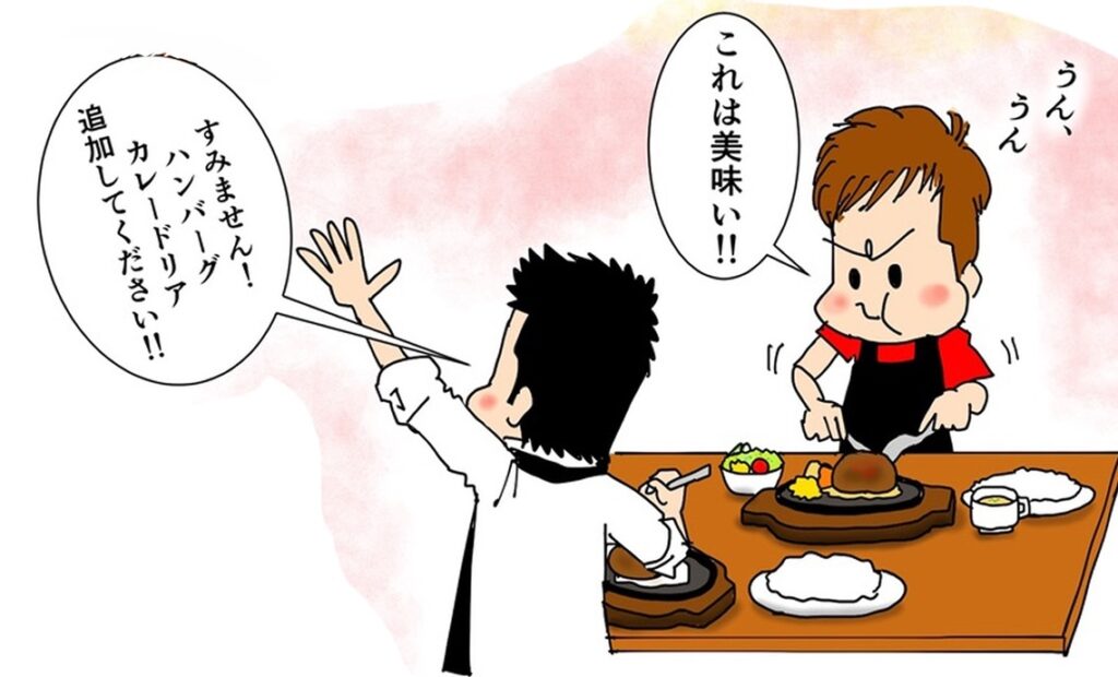 “This is delicious!” “Excuse me! Can we get another hamburger and doria, please?”
