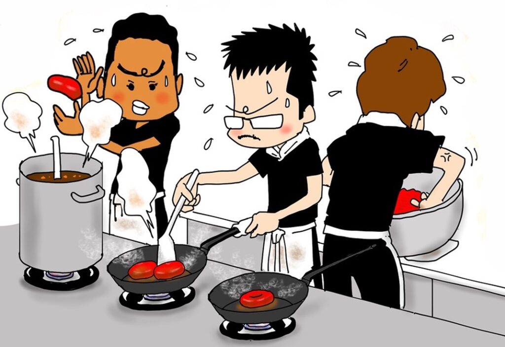 Amidst the bustle reminiscent of a Western-style restaurant, all the staff were running around clutching frying pans.