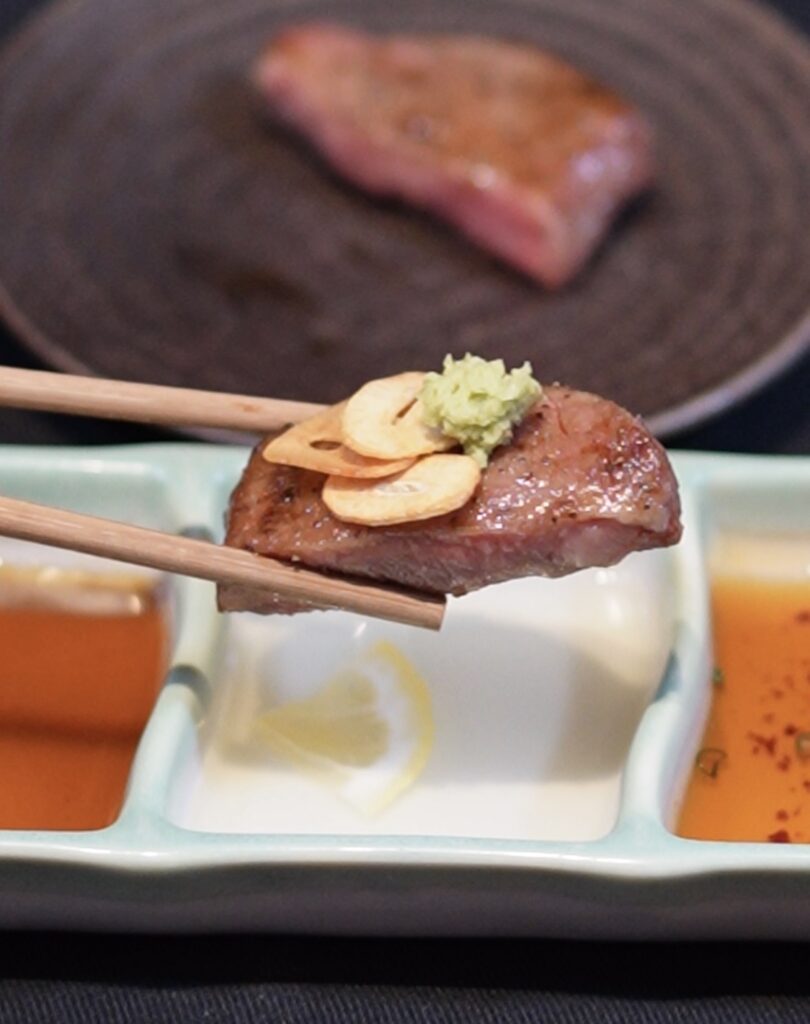 Wagyu tongue root is exceptional. When sliced thin, it can be enjoyed rare or seared on one side only. The fine marbling melts quickly, and even lightly cooked wagyu tongue remains sweet, tender, and aromatic.