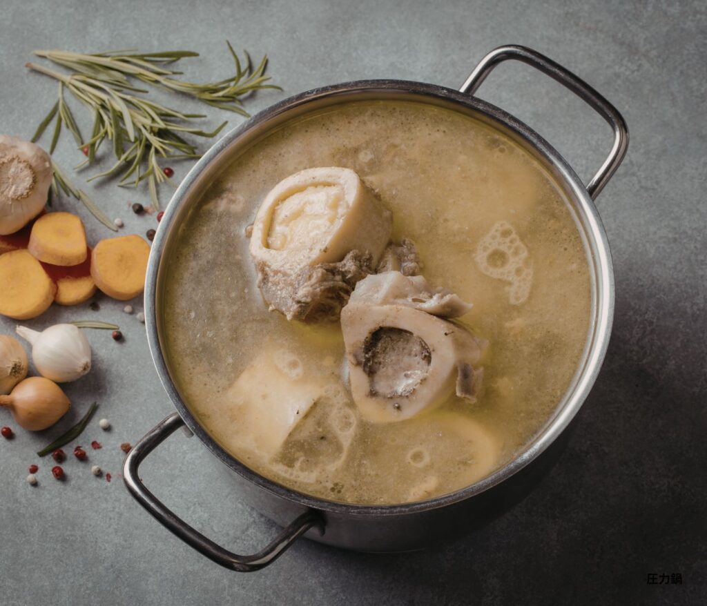The stars of bone broth are the “bone marrow” hidden inside the bones and the cartilage (collagen) around the joints. These are protected by extremely tough tissue, but the high-temperature and high-pressure environment of a pressure cooker effectively loosens this hard bone structure. As a result, nutrients like amino acids and minerals migrate into the liquid much more efficiently than with normal boiling. When you chill the finished soup in the refrigerator and it solidifies into a jiggly jelly, that is the ultimate proof that high-quality gelatin has thoroughly melted into your broth.