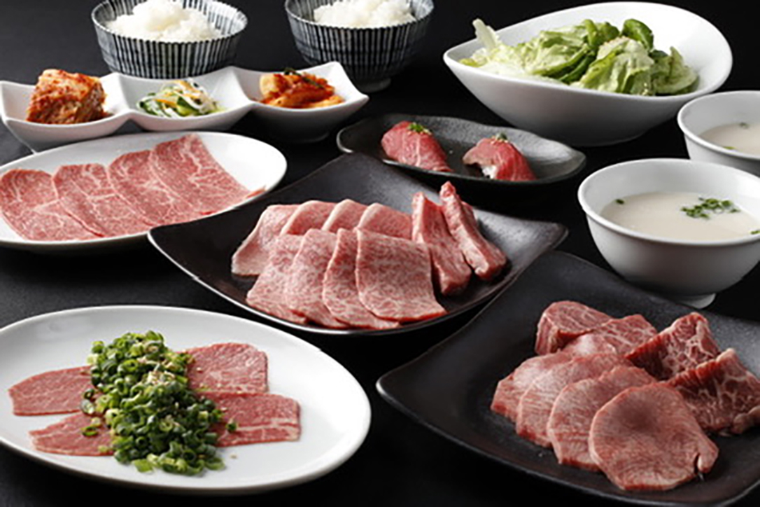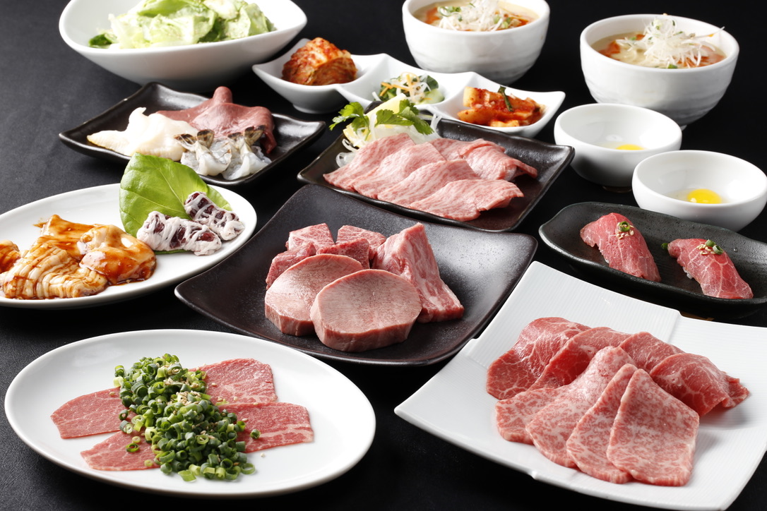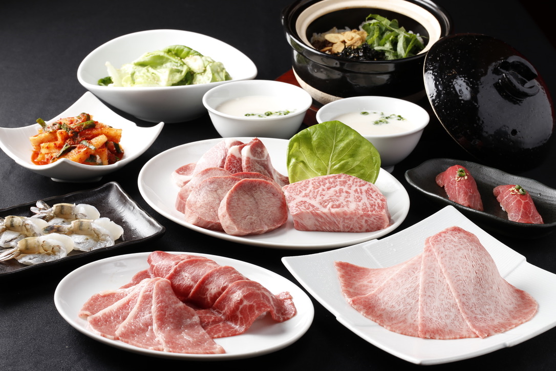 Appetizers with Wagyu Nigiri, luxurious grilled meats including Premium Roast, and a lavish plan with Comtan Soup and Kuro 5 Rice.